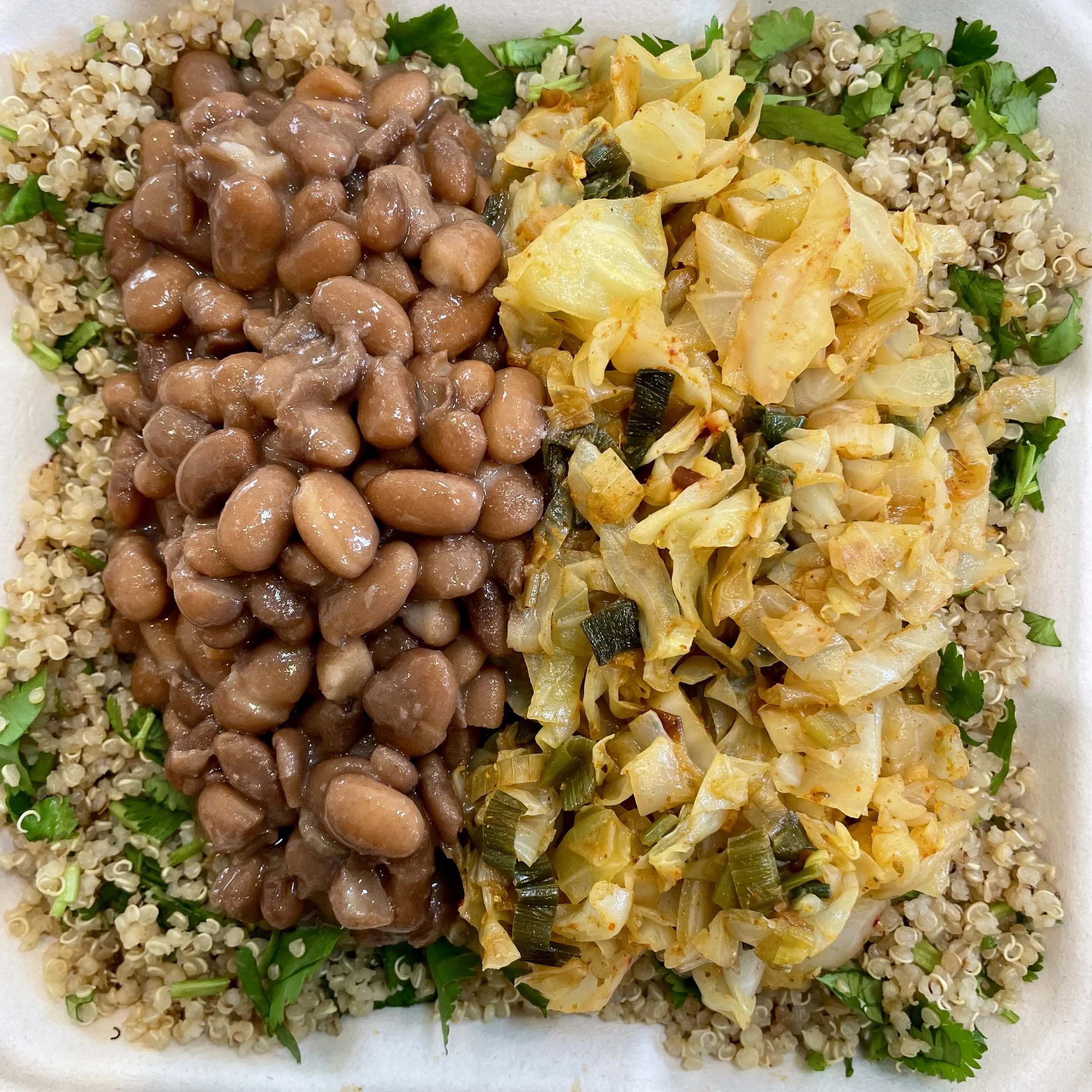 Pinto beans and braised green cabbage with fresh red onions over toasted quinoa and cilantro. This is a very satisfying plant-based meal loaded with protein, fiber, and micro-nutrients.