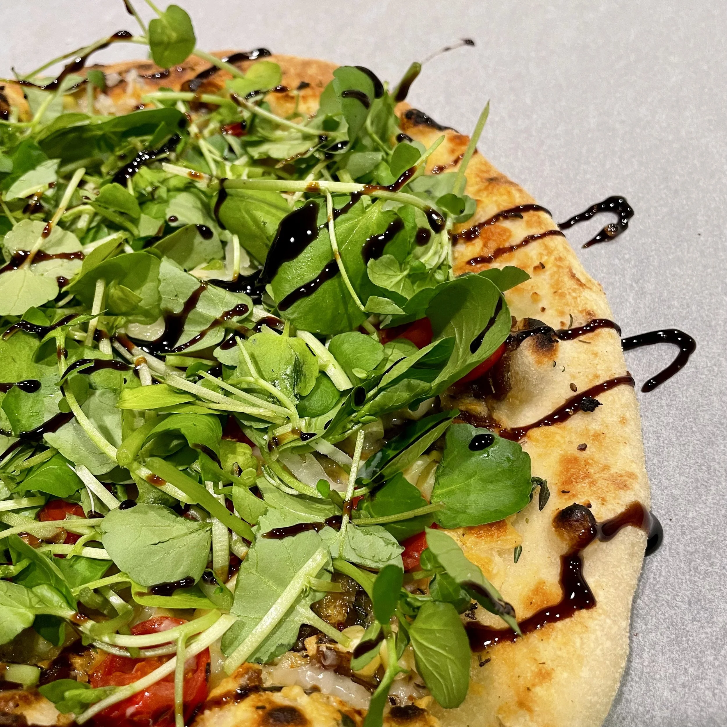 Pizza from scratch with tomato, garlic, corn, parsley and watercress. The drizzle over the top is a balsamic vinegar reduction which adds acidity and deliciously subdues the bitterness of the watercress.