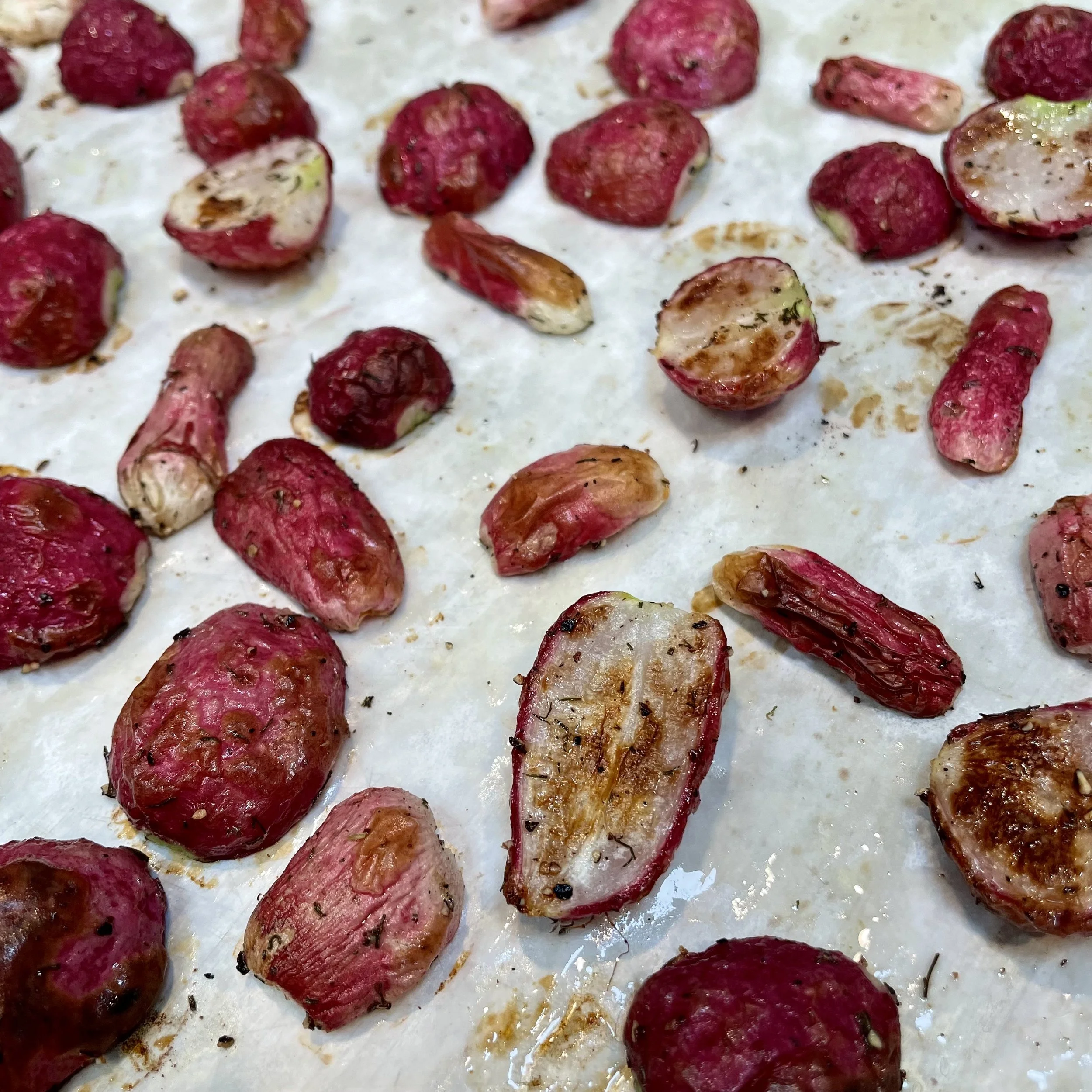 Oven roasted radish tossed with dill, garlic-infused extra virgin olive oil, and salt. Just like the beets, these are phenomenal in salads or as a side dish. If you find yourself avoiding radish because of their sharp flavor profile, you MUST try them roasted. They taste just like potatoes! :)